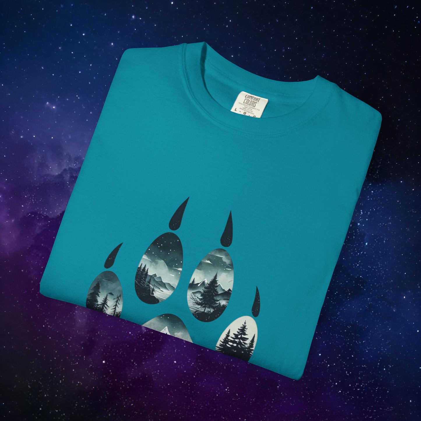 Mystic Wolf Paw Wilderness T-shirt -Night Landscape Graphic Tee, Nature Adventure Apparel for Hikers & Outdoor Lovers - Ethereal Mountain Print