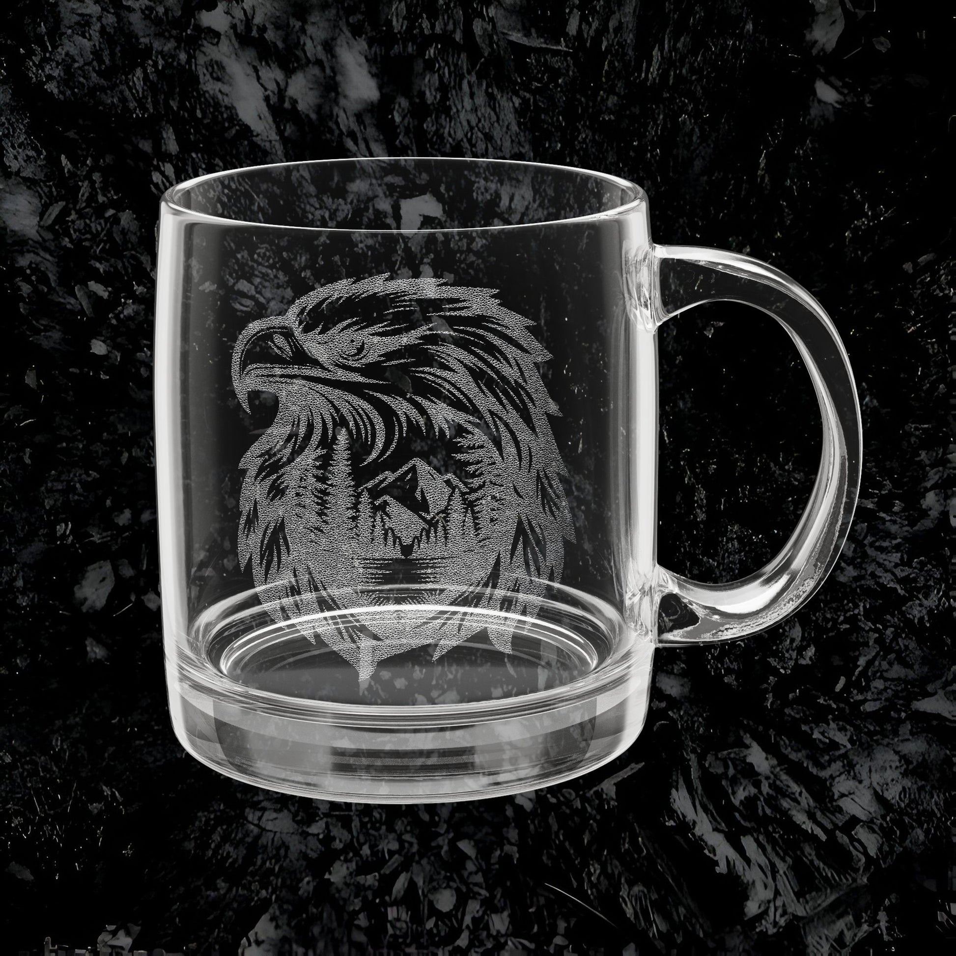 Engraved Glass Coffee Mug β Eagle & Mountain Wilderness Design | Dishwasher & Microwave Safe