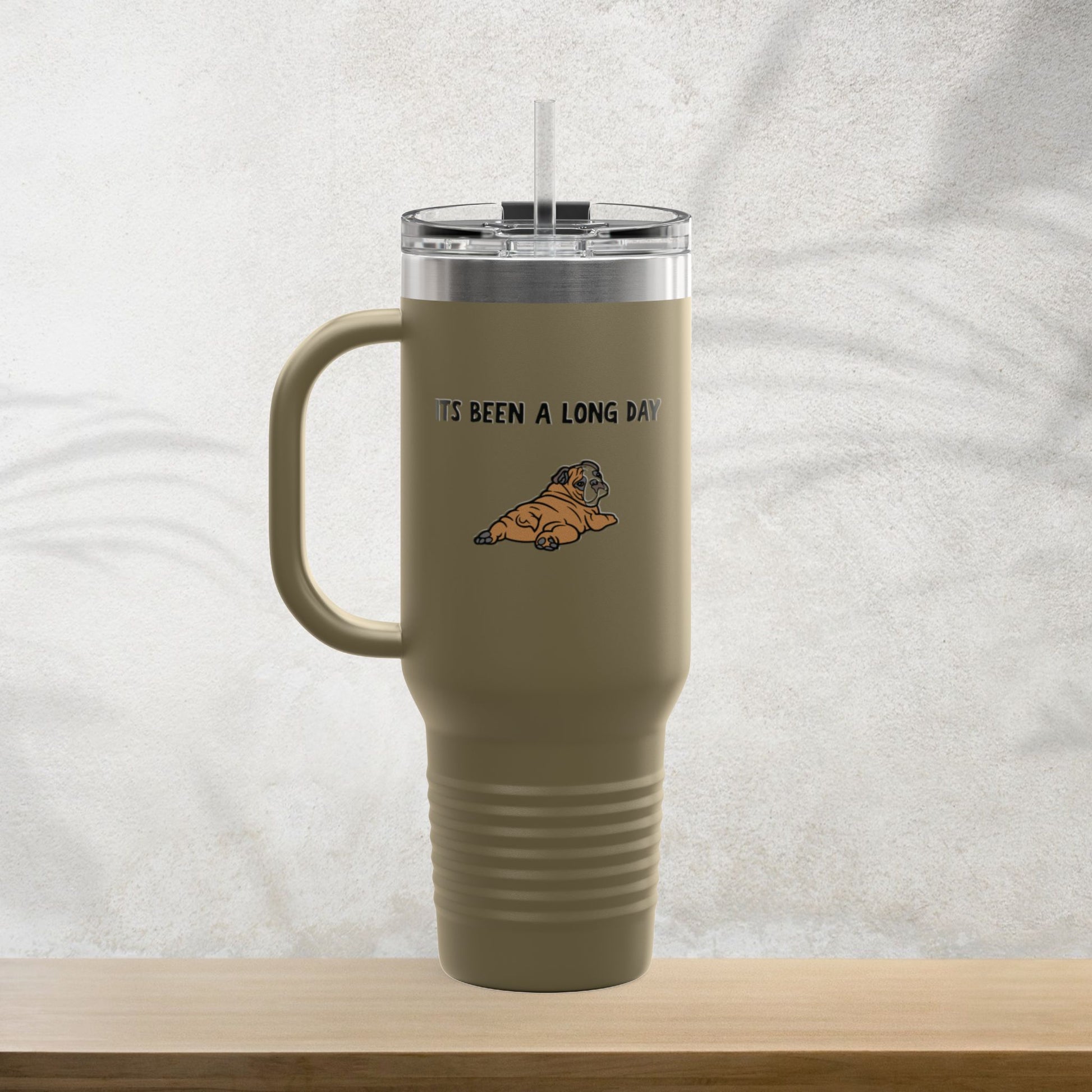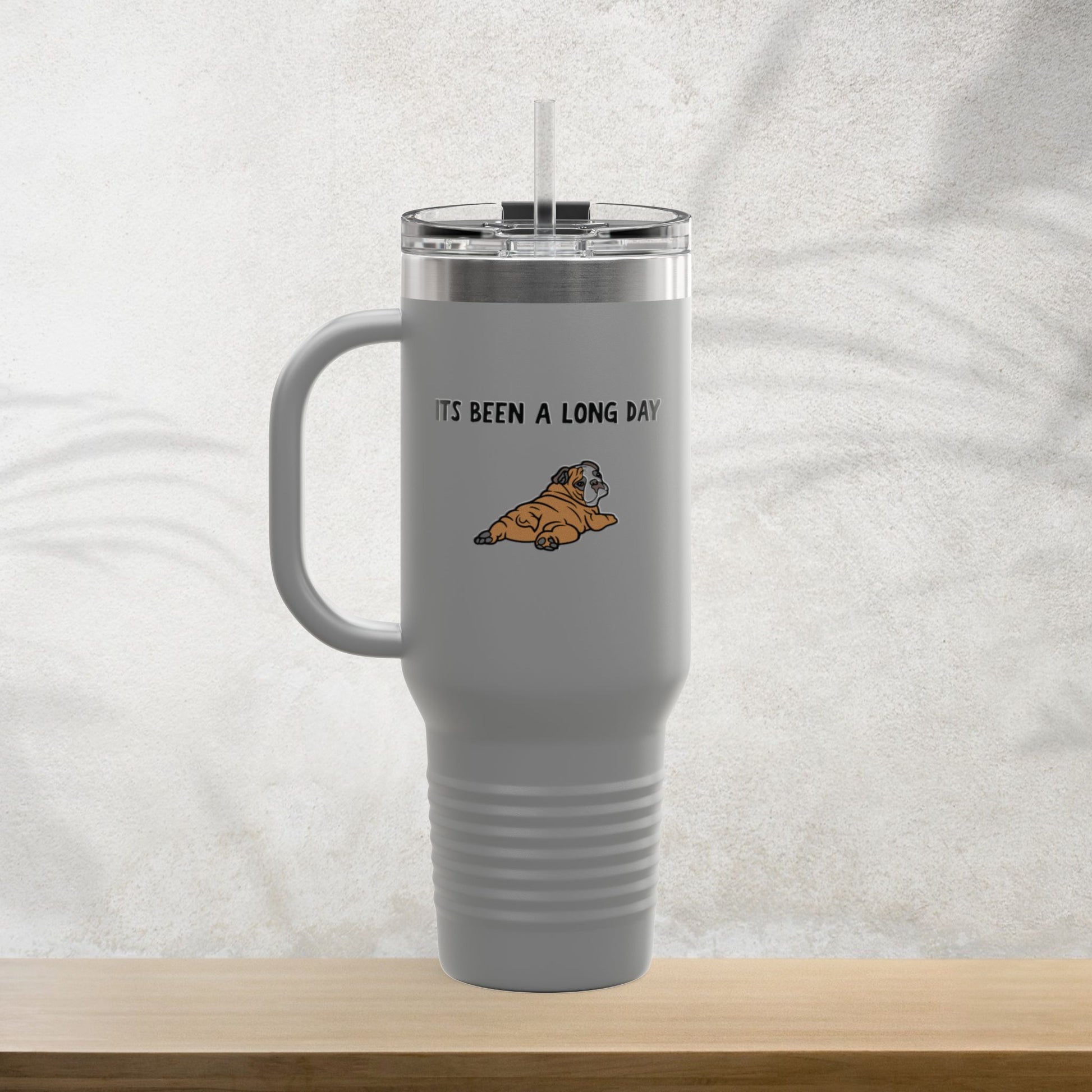 “It’s Been a Long Day” Tired Bulldog 40oz Travel Mug – Cute Funny Puppy Design for Coffee Lovers