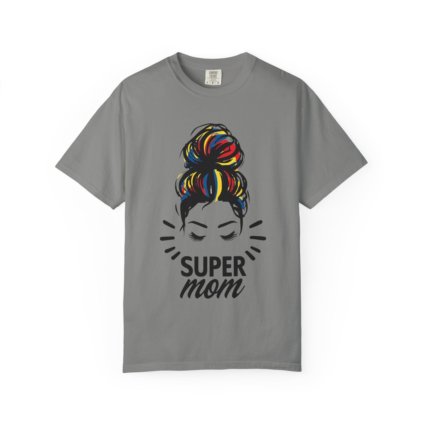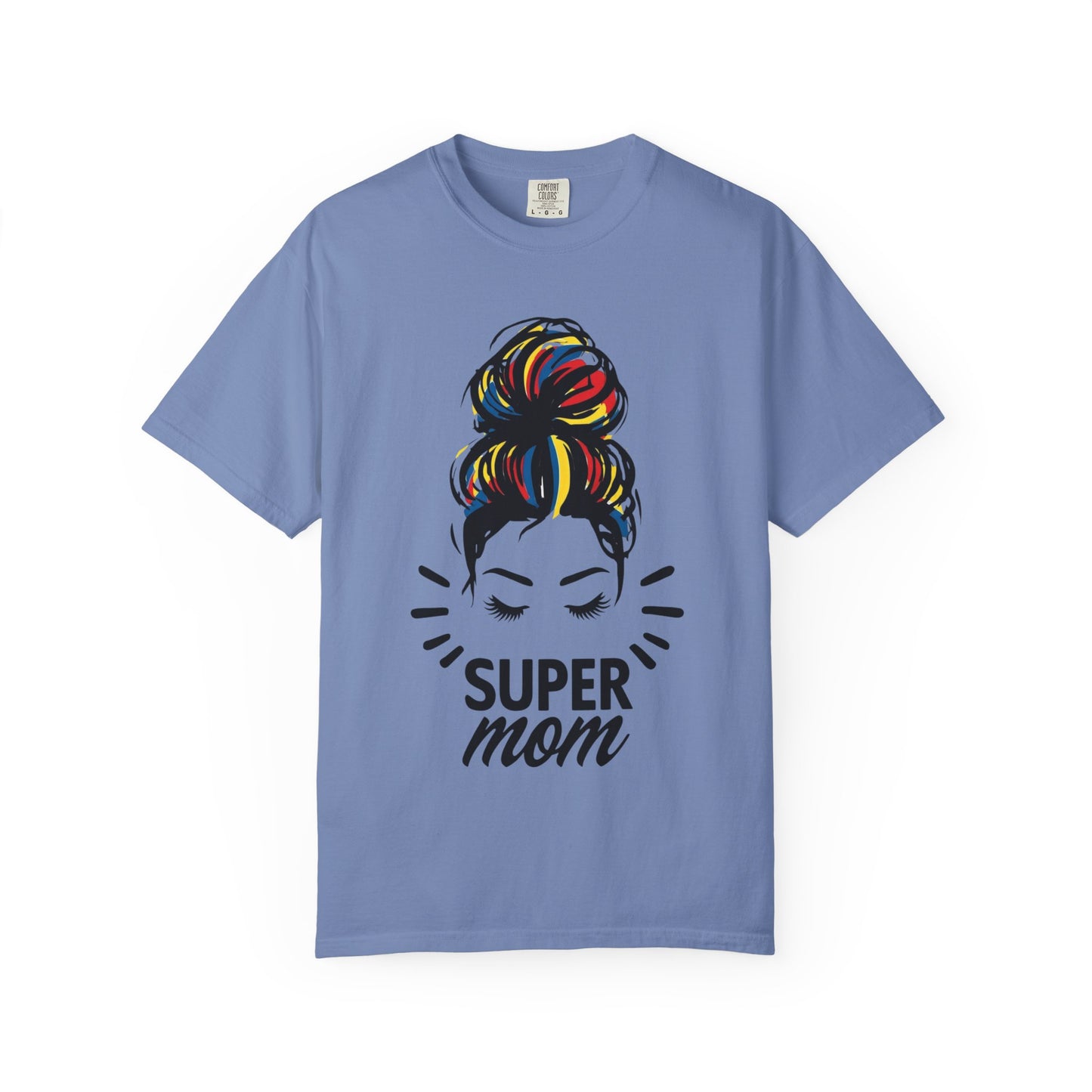 Vibrant, bold, and colorful Supermom Women's Tee made of garment-dyed fabric. This tee exudes a positive and energetic vibe, perfect for moms who want to showcase their colorful personality. Ideal for Mother's Day, birthdays, or any occasion where you want to celebrate a strong, vibrant woman.